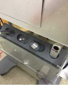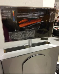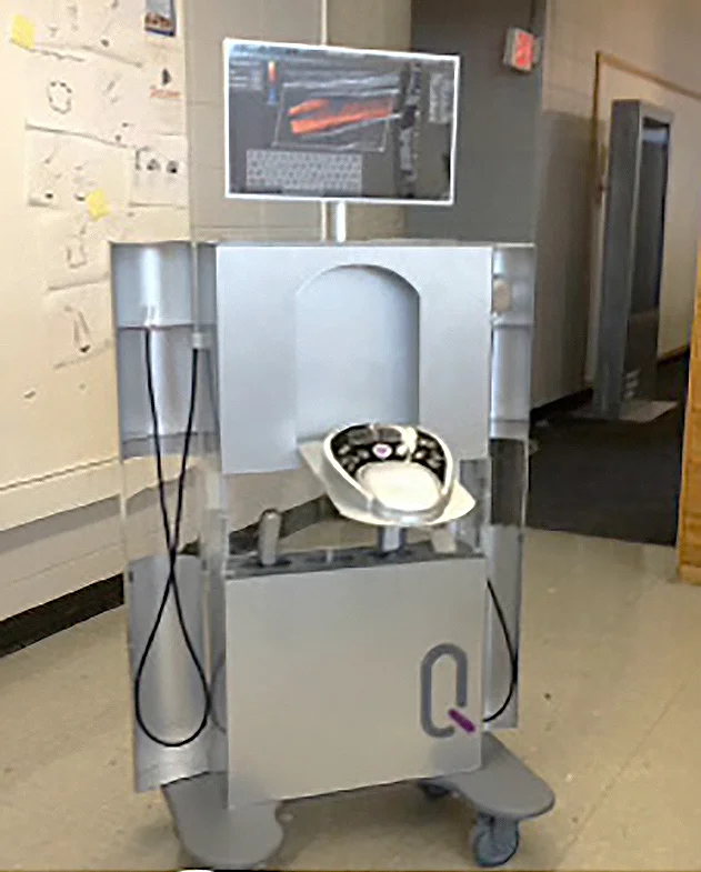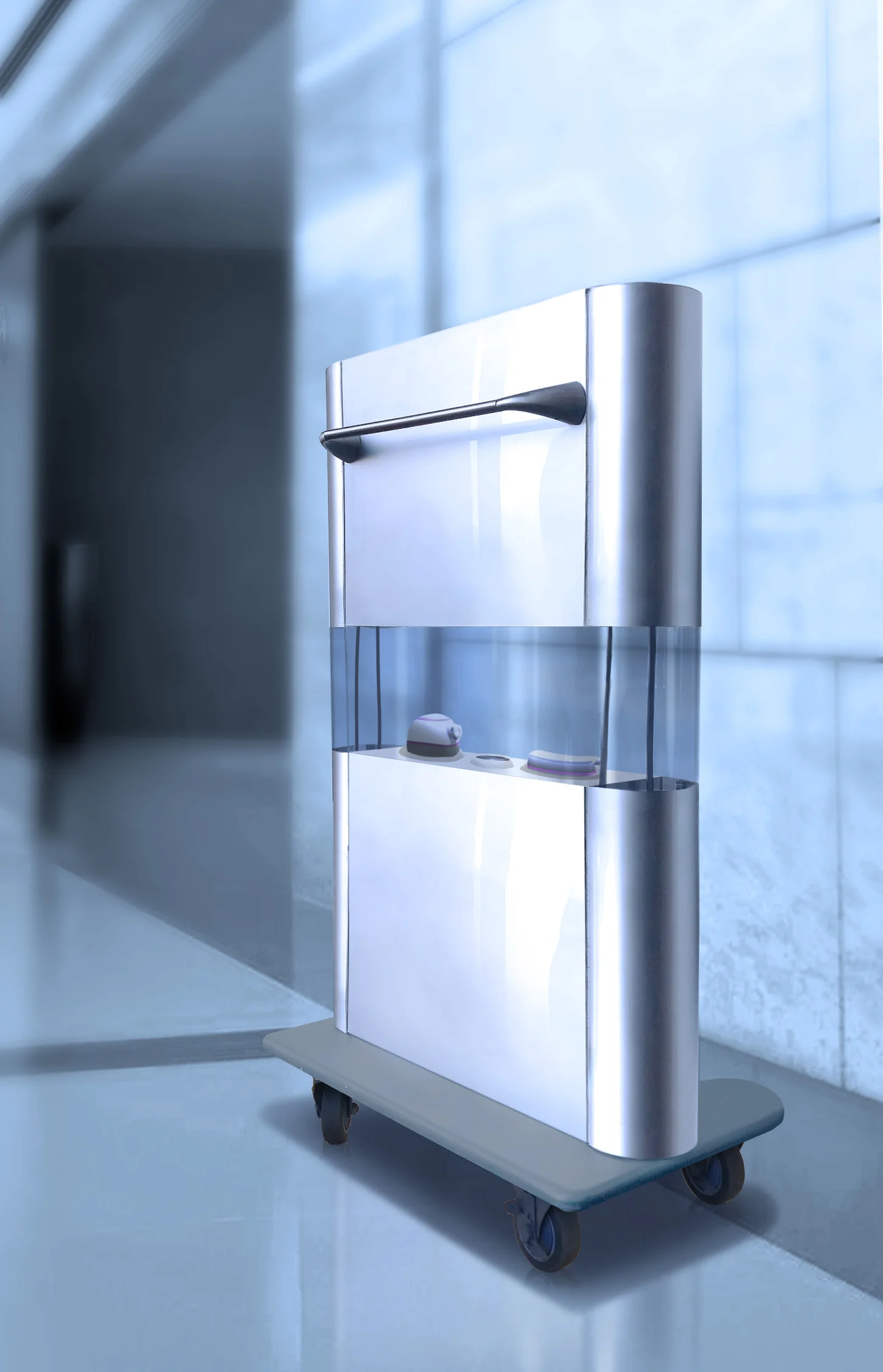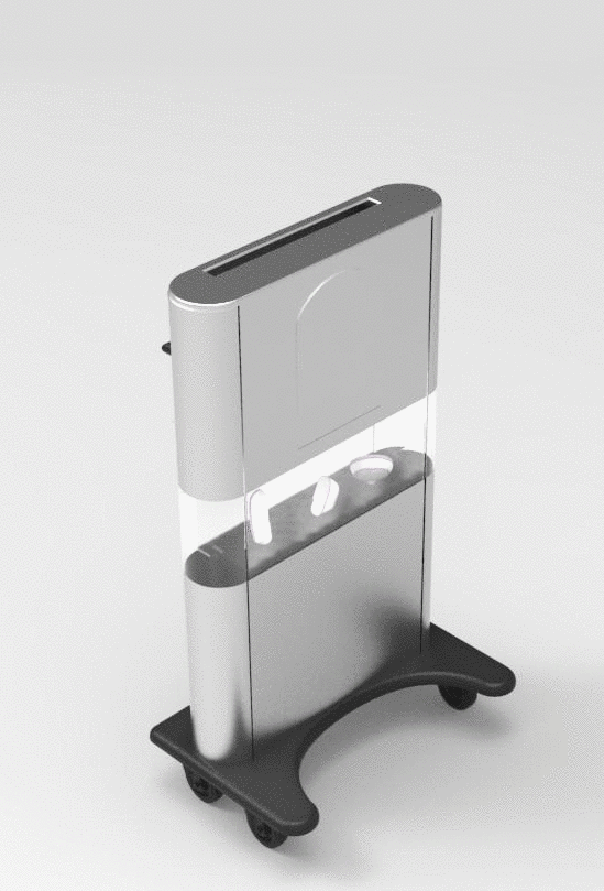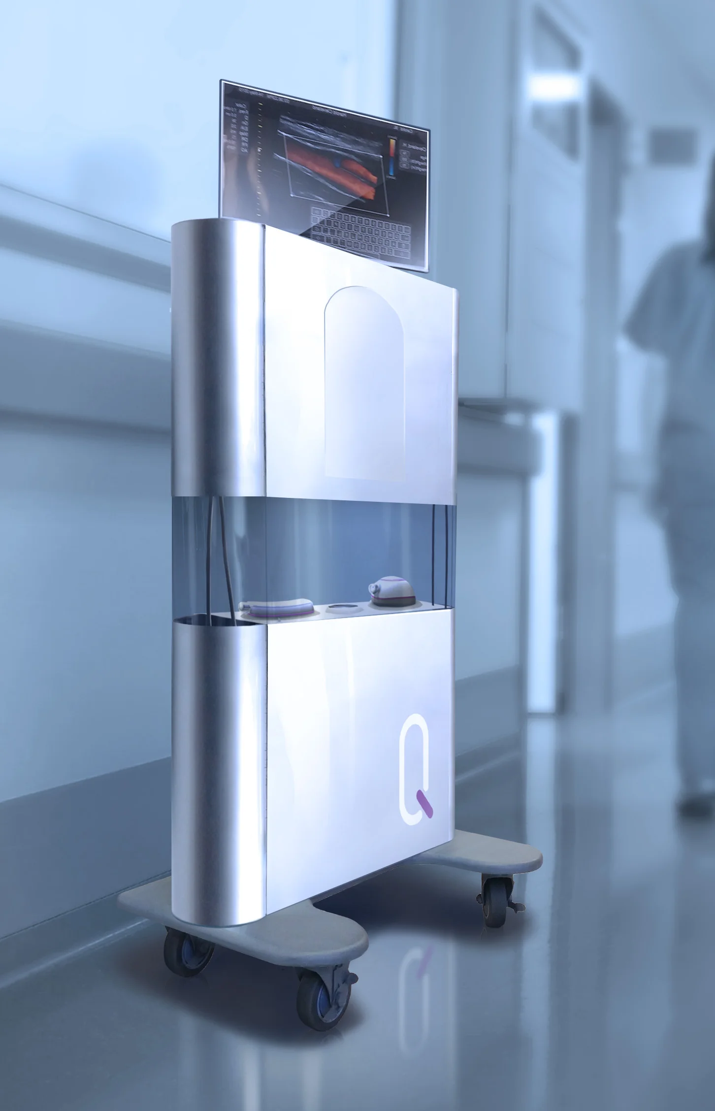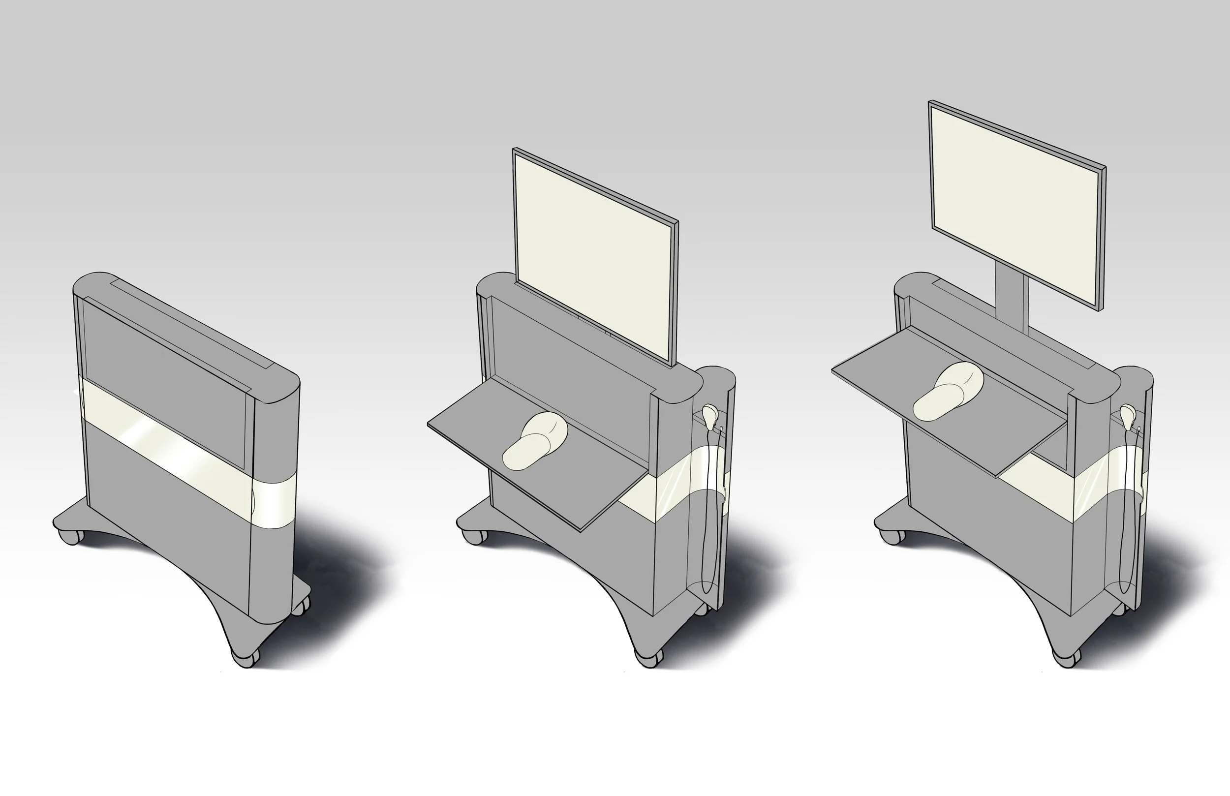 Q is a conceptual ultrasound diagnostic imaging machine. It features a modern, monolithic form that neatly stows the screen and imaging components when not in use. The structure, interface, and transducer design offer a level of utility, adjustability, and aesthetics not found in traditional ultrasound systems. Q is designed as a specialized, luxury device committed to exceptional functionality while embracing modern technologies and visual appeal.